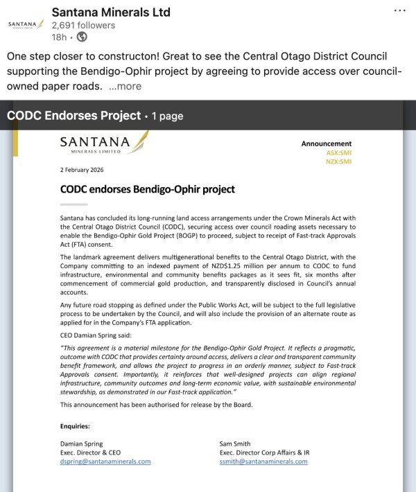 In fact the council has been highly critical of the mine project in their official submissions to the Fast Track approval panel that is due to start their hearing later this month based on an expected, extended hearing duration increased from Santana’s 30 - 60 day preference to 140 days from the Otago Regional Council and the CODC.